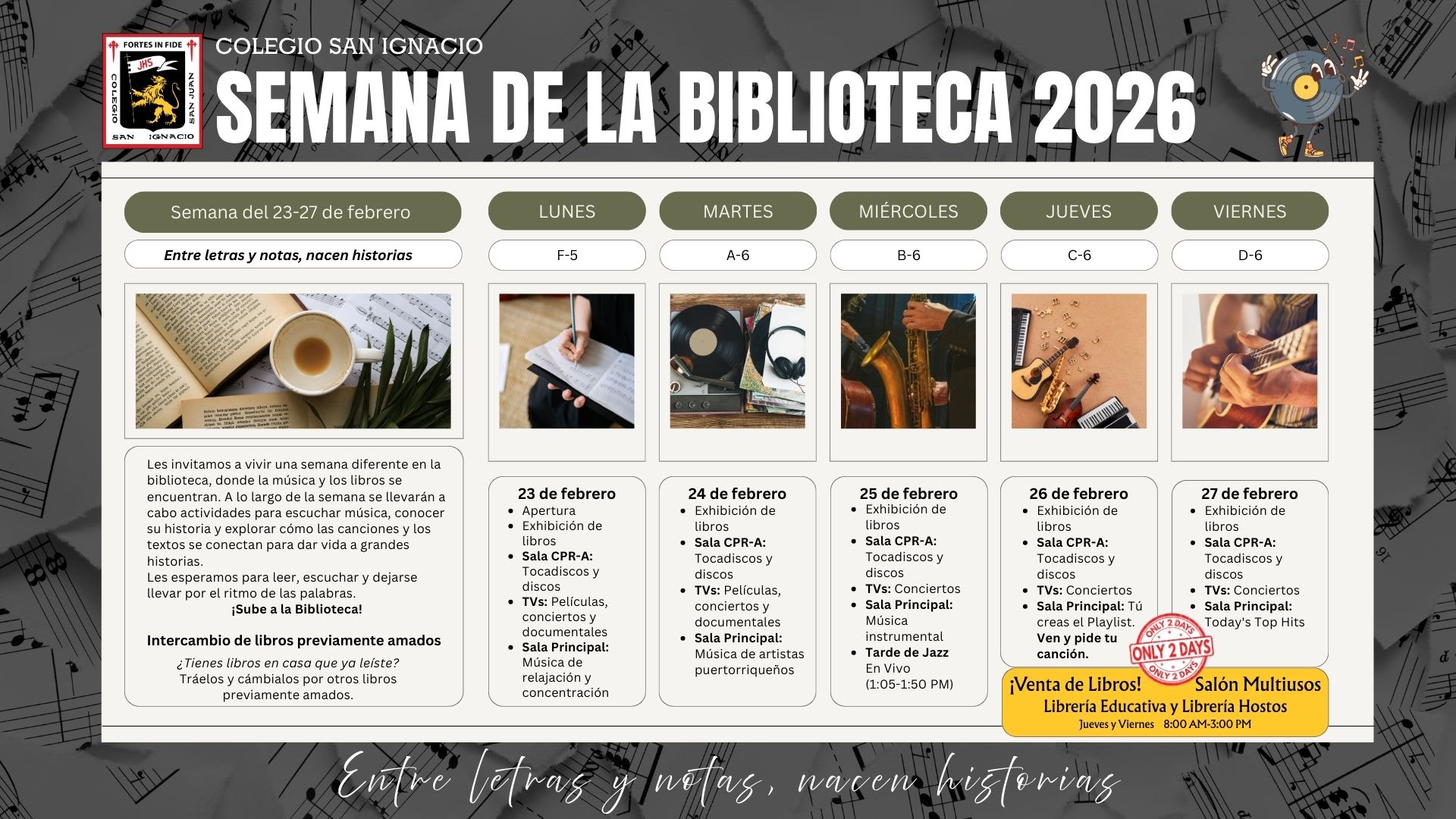 Aprende a escoger música para concentrarte, a utilizar un tocadiscos y ven a disfrutar de la colección de discos de la Biblioteca. El miércoles 25, tendremos una Tarde de Jazz🎷 en vivo con un grupo de estudiantes, dirigidos por el Prof. Ángel Vázquez y el jueves 26 y viernes 27 la venta de libros📚 con la visita de la Librería Educativa y Librería Hostos (métodos de pago: efectivo, tarjeta, Apple Pay y ATH Móvil). Ver el calendario de la semana para horarios y más detalles.